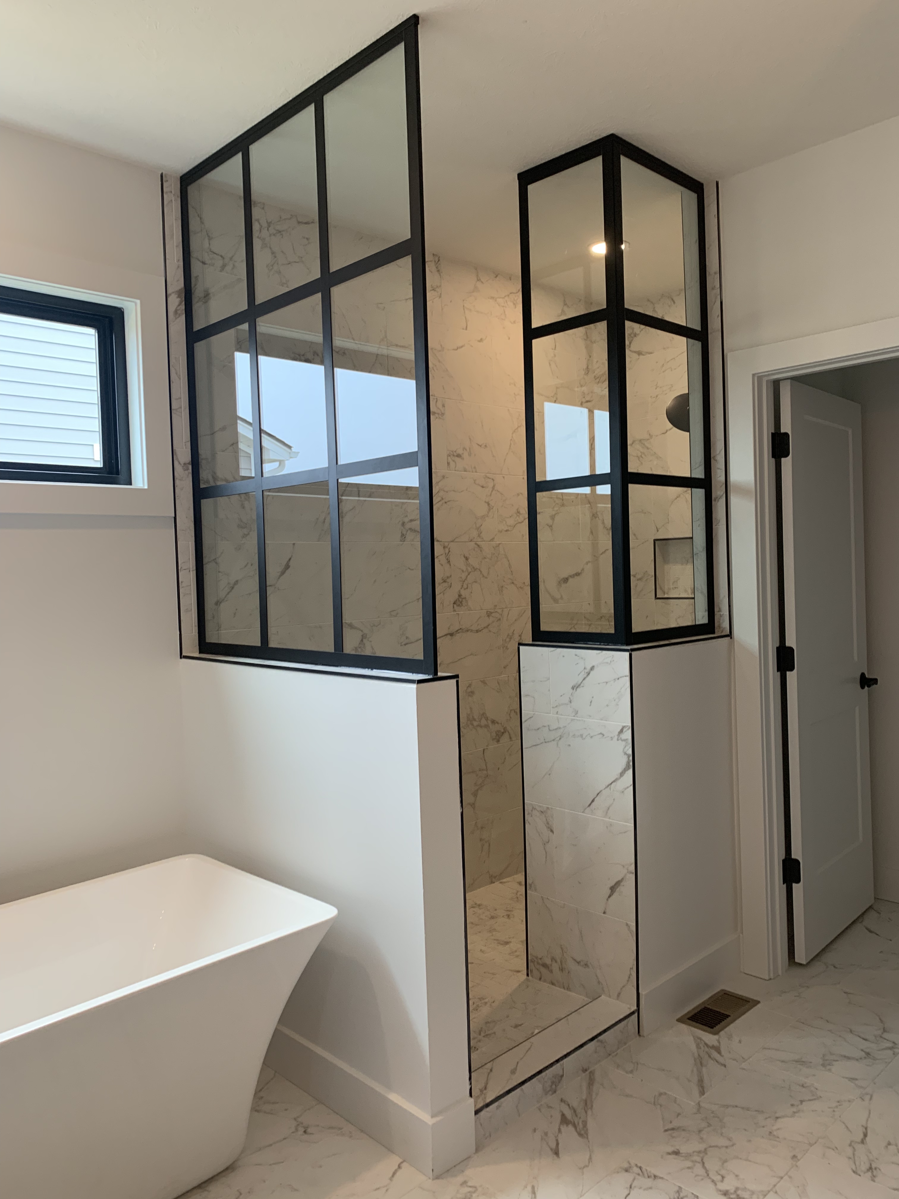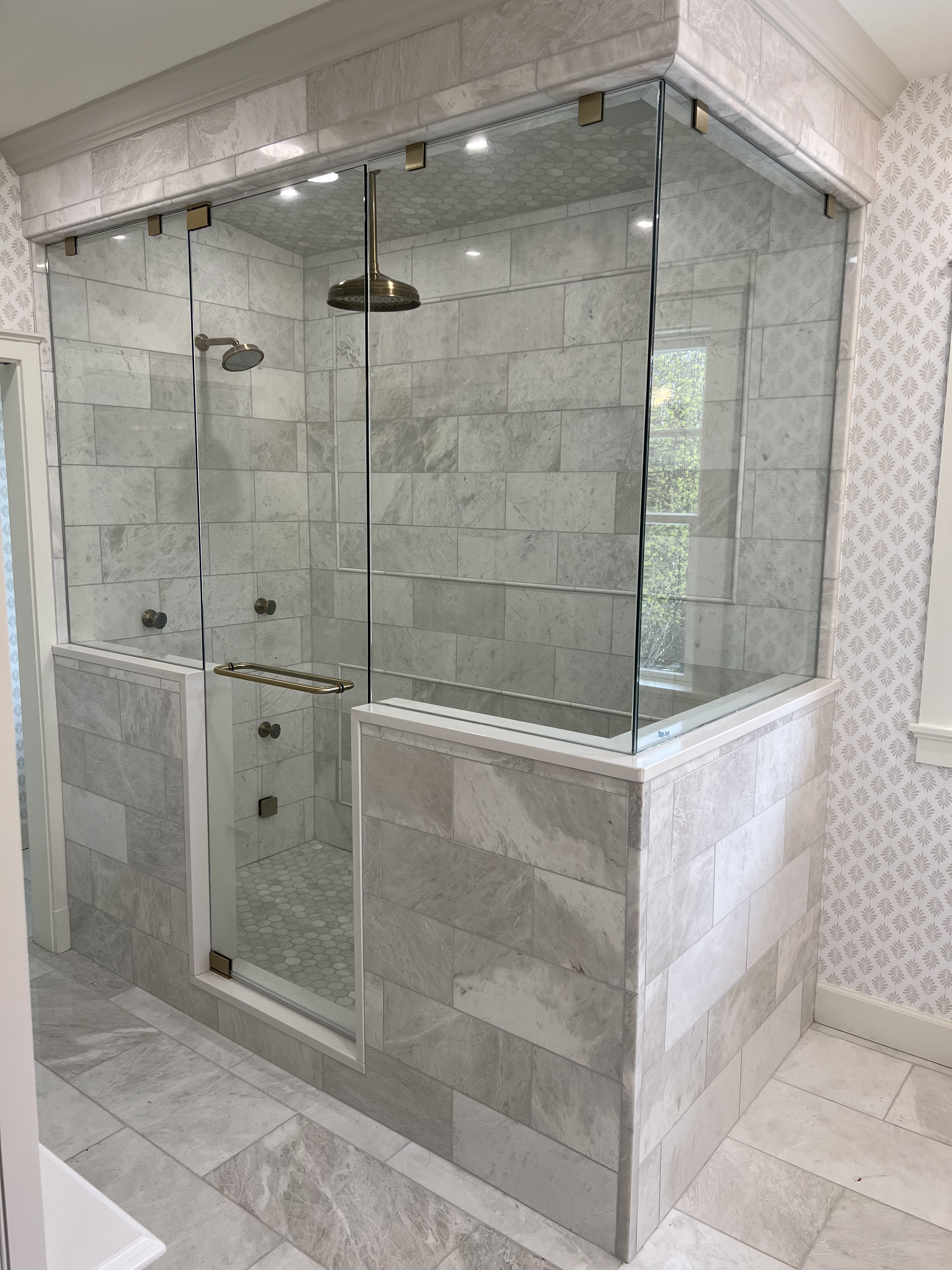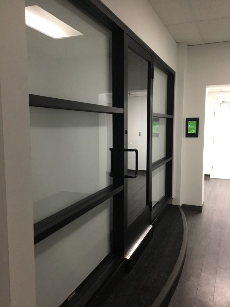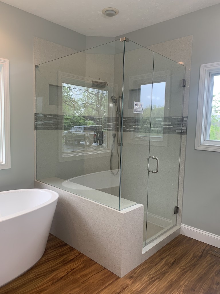 Every so often, clients will ask about the shape of the extrusions on our bypass doors. The main concern being, “Will it hold water?” With a sloped threshold and just a center guide for the glass, this option allows water to run off rather than pooling and causing mineral build up on the framework.